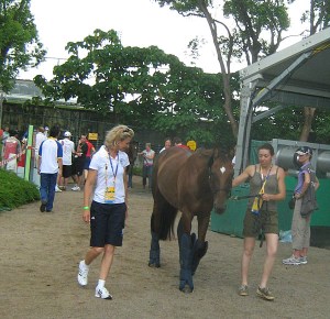 The meeting covers items such as hours of operation for the dining areas, training hours for the indoor arena and the outside arenas etc. The news everyone was waiting for was the opening of the main competition arena. Over the next few days it will be open to the Eventers and the Dressage riders so they can start to get their horses used to the area. The organizers explained that the arenas are open until 9pm at night but the question was quickly raised as to whether this can be extended until 11pm at night. It doesn’t start getting dark here until about 7:30pm, and the majority of riders are eager to train under the bright outdoor lights since most of the competitions will take place until the evening running until 11pm or later. I suspect that the organizers will likely grant this request and likely extend the ‘quiet time’ in the afternoon to be for a longer period to compensate. ‘Quiet Time’ is when there is to be no riding/training. The FEI stewards want to ensure that rest time is built into each day to allow horses to relax. Right now it takes place from 12pm – 2pm every day.
