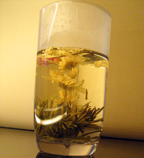 the most delicious and beautiful tea was served. this started out as a little ball at the bottom of the glass but within seconds the hot water expanded it into this amazing flower.