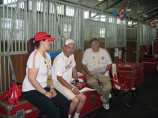 The horses continue to look very well and seem to be adapting no problem to their new digs and the weather. The weather doesn’t seem to be an issue at all. I have asthma and have had no problems. When it gets particularly hot, there might be a bit of a haze…..but then again, the same thing happens in Toronto when it gets really hot. With the main competition arena being open now at night until 10pm there are many riders who take the horses out lightly in the morning, then again in the evening to school. Not long now before the first jog for the Eventers on August 8th! The Canadian Eventing Team seem to be in really great spirits with all horses doing well. They even did a gallop on the famous track at Penfold Park. How cool is that?