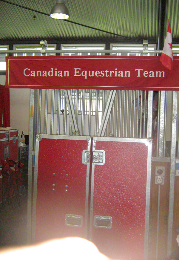 This is a couple of days late……been difficult for me to hop on the computer and make a proper update. The Jumper horses arrived about 1 hour early at 1pm. Unfortunately 3 of the jumper grooms were still in North America as their plane was delayed due to bad weather. Only Sergio (Jonathan Asselin’s groom) made it ahead of time with Jerome (Eric Lamaze’s groom), Lori (the team’s stable manager) and Sylvie (the team’s vet) travelling on the plane with the horses. Team Canada spirit kicked in and the Eventers made sure that the jumper stalls were bedded and ready. The Dressage team made sure that hay was on order and found some water buckets to fill and hang in the stalls.
