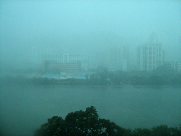 Since there wasn’t anything in the books today except for a team leader meeting at 7pm, I had planned to catch some extra zzzzz’s and catch up on some computer work. This was cut a bit short when Mike called me at 7am to let me know that there was a Typhoon Level 8 warning in effect. My first question: Do I need to go anywhere? Answer: no, stay in the hotel. Question: can I stay in my room? Answer: Yes. So with that I snuggled a little deeper under the covers and listened to the wind howling against the windows and the rain beating down hard. Curiosity got the better of me and I got up to take a peek outside. This is what I saw: