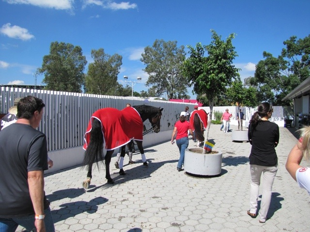 Then back to the country club to hand out the passes, deliver clothing, quickly take a few snaps of our horses so smartly turned out for the practice jog (real one tomorrow at 9am). Then back to the hotel to change into the official opening ceremony gear and head back down to the Village.