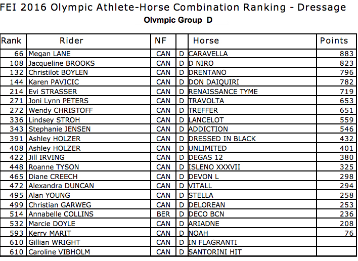 - Groups D, E (4 Quota places): The first place athlete in each Group on the FEI Olympic Athletes Ranking INCLUDING the highest ranking athletes from the Grand Prix at the 2015 Pan American Games (which is Canada and Mexico)